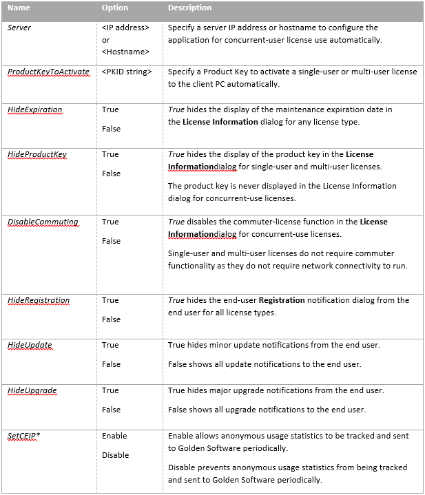 ** SetCEIP の設定内容は、ソフトウェアの Options ダイアログにある Track Usage ボックスにチェックを入れることでユーザーによって上書きされる場合があります。