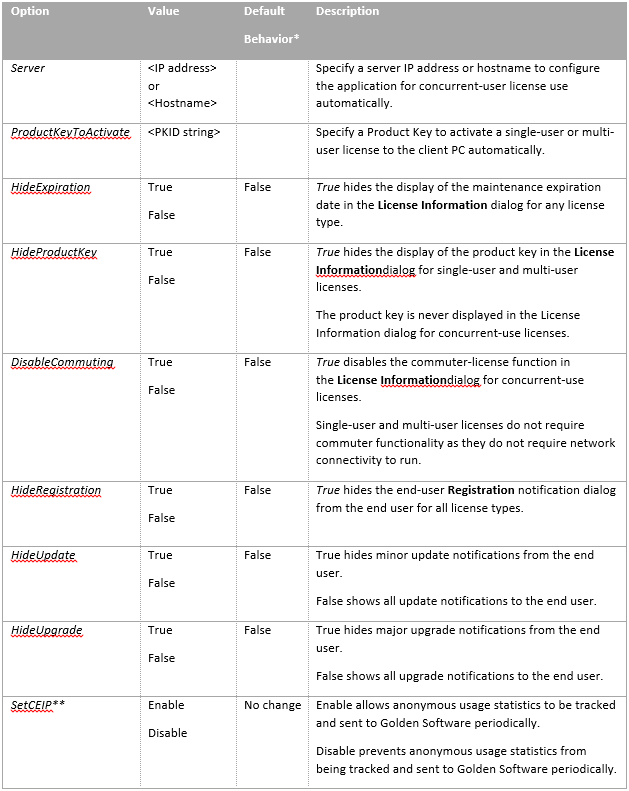 以下のテーブルは、ライセンス設定ファイルを使用して設定可能なオプションに関する追加情報です。