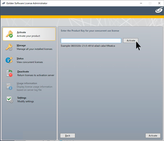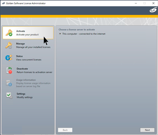 同時使用ライセンスのプロダクトキーのアクティベートは、サーバーコンピューター上で行う必要があります。ライセンス管理を支援するために用意されているソフトウェアが Golden Software License Administrator です。ライセンスサーバーをセットアップするには、以下の手順に従ってください。