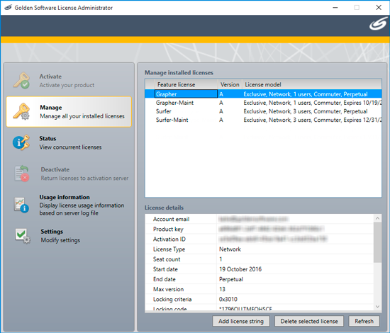 などです。これらの情報を表示するには、Golden Software License Administator を起動して、ウィンドウの左側にある Manage をクリックします。画面の右側に Manage installed licenses セクションが表示されますので、その中から内容を確認したいライセンスをクリックしてください。