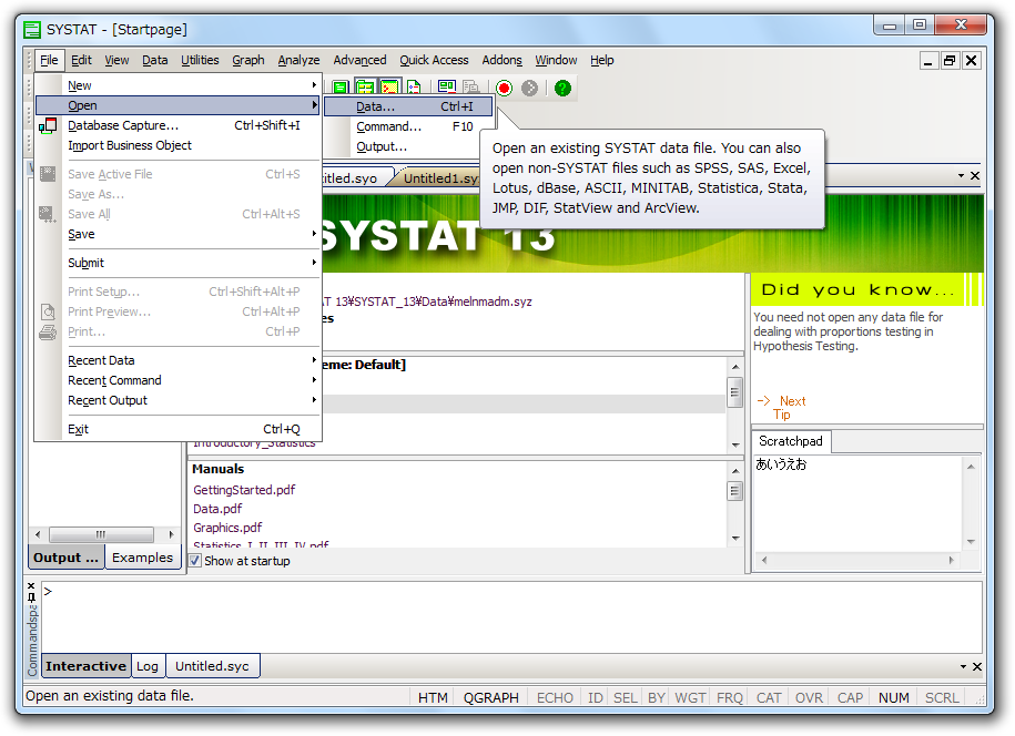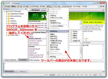 | 日本語メニュー用テーマ Default_Japanese_thmfiles.zip (36.4KB) 上記ファイルをダウンロードし、展開したフォルダとファイルを次のパスにいれてください。 C:\Users\<ユーザー名>\SYSTAT\SYSTAT_13\Themes SYSTAT を起動したら Startpage のテーマから Default_Japanese を選択してください。 ![]() ※日本語になるのは、メニューボタンのみとなります。 |