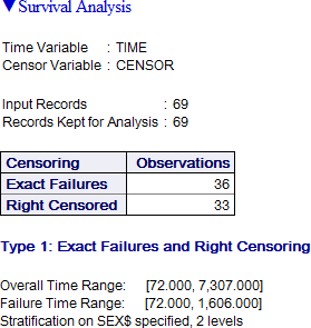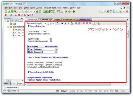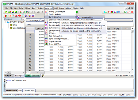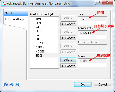 SYSTAT で生存分析をするために必要な情報は、Time (時間)、Censor Status (打ち切り変数)、Strata (層別変数) です。(TIME、CENSOR、SEX$ です。)