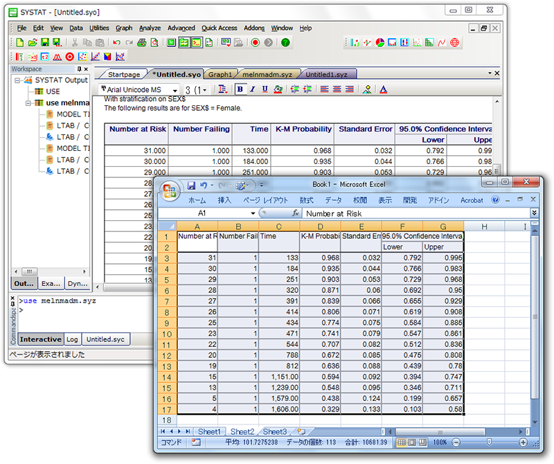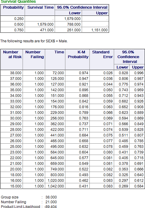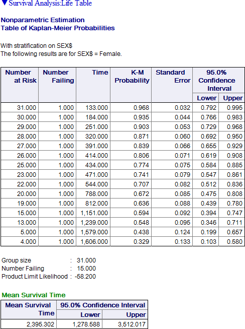 Survival Analysis:Life Table では、K-M Probability (累積生存率)、Standard Error (累積発生率)、95% 信頼区間等を示す生命表及び Mean Survival Time (平均生存時間)、Survival Quantiles (生存変位値) が各々のグループについて表示されます。