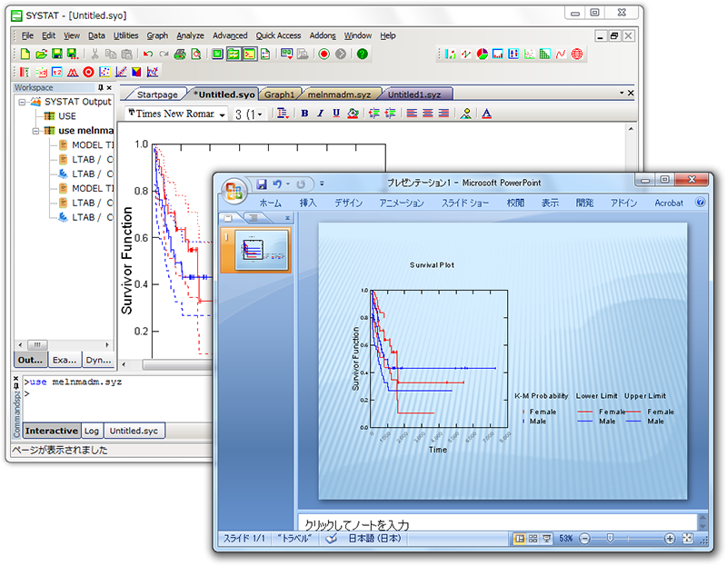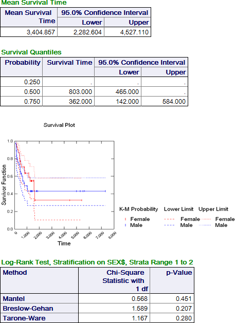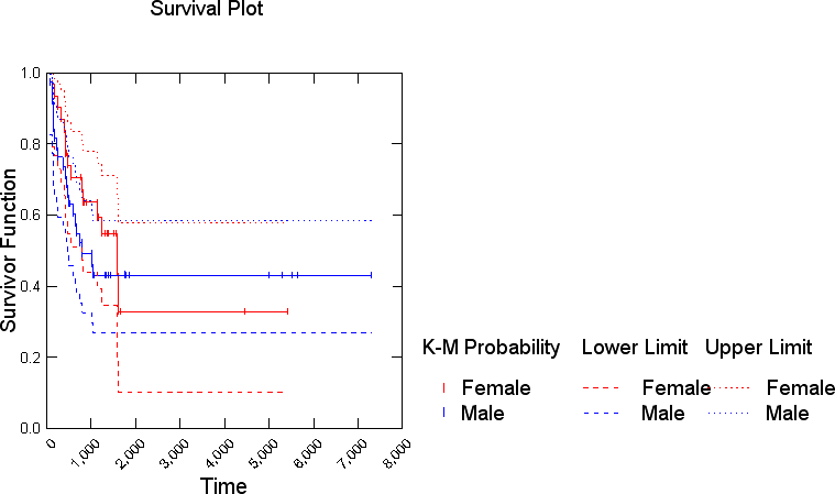 ここでは、性別間による生存予後について検討します。充分なデータ数がないためノンパラメトリックの Kaplan-Meier 法を採用し、累積生存率を計算させ生存曲線を表示します。性別間の有意差検定は、Mantel-Cox、Breslow-Gehan-Willcoxon、Tarone-Ware の計算結果で確認します。