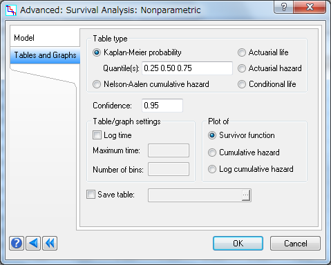 ツールバーから Advanced (アドバンス) → Survival Analysis (生存分析) → Nonparametric (ノンパラメトリック) を選択します。