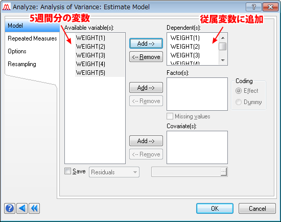 3. Estimate Model のパネルで次のように 5週間分の変数を Dependent (従属変数) に追加します。 (ダブルクリックでもドラッグ&ドロップでも追加できます。)