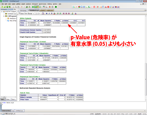 p-Value (危険率) が 0.000 と有意水準 (0.05) よりも小さいことから、繰り返し測定した要因がラットの体重に影響していることが認められました。