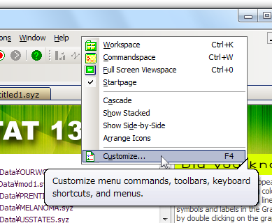 1. ツールバーの空きスペースのどこかを右クリックし、コンテクストメニューから Customize ボタンをクリックします。メニューやツールバーなどをカスタマイズすることができます。