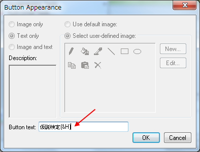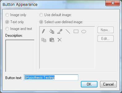 6. ここではボタンとして表示されるテキストの内容を変更できます。Button text: の内容を「仮説検定(&H)」に変更してみましょう。