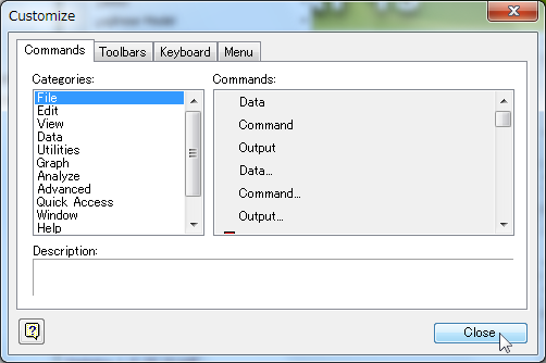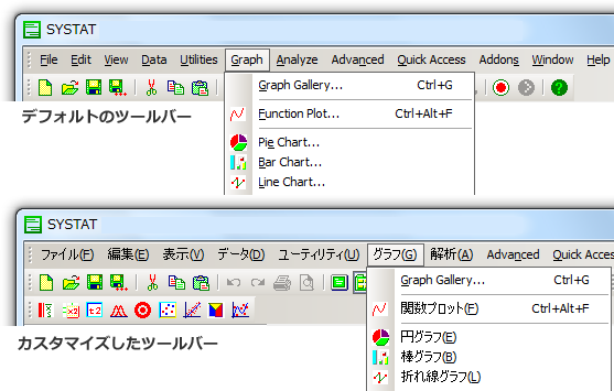 これを選択すれば、分野別の環境で作業することもできますが、SYSTAT のカスタマイズ機能を使えば、使う人それぞれの目的や用途にあわせてツールバーの表示や配置を自由にカスタマイズし、オリジナルのテーマとして保存することができます。