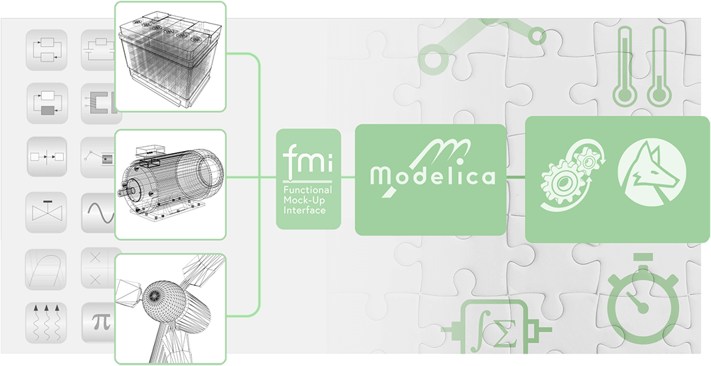 ModelicaとFMI (Functional Mock-up Interface)を使って、小さいサブシステムを複雑なマルチドメインアーキテクチャにスケールアップし、シームレスに一つの環境に統合します。