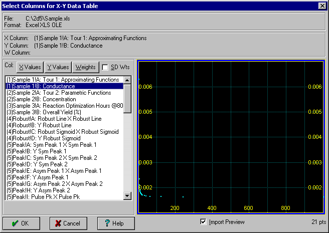 - Y-variable には、Conductance を選択して下さい。Import Preview チェックボックスを ON にすると、インポートするデータのグラフを表示してくれます。