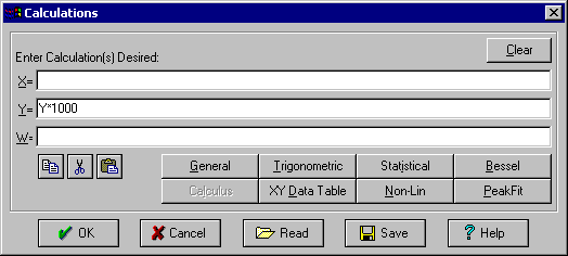 Data|Enter Calculation メニューコマンドを実行します。Y= のフィールドに Y*1000 と入力して OK ボタンを押し、続いて計算結果を直ちにデータテーブルに反映させるため、はいを選択します。