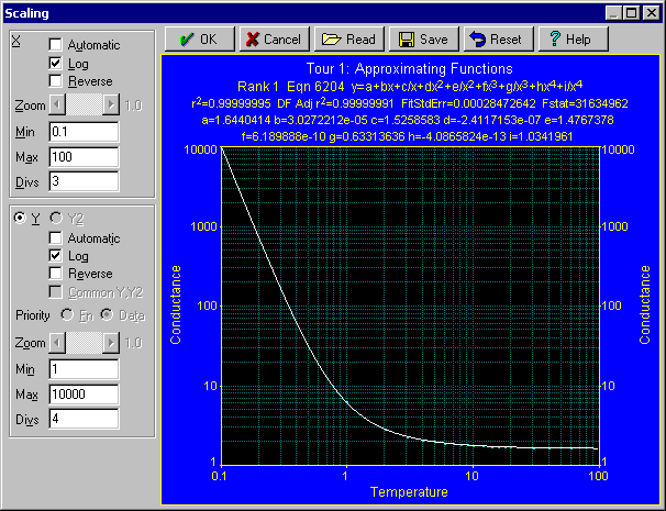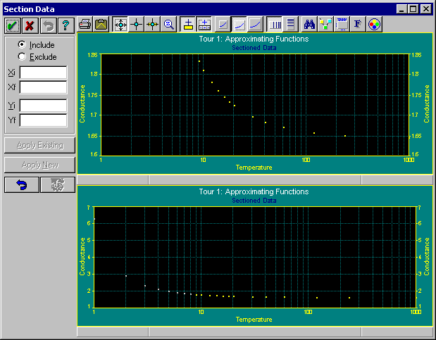 - ツールバーの Modify Graph Titles ボタンをクリックして下さい。X のフィールドの「Temperature」の後に「(K)」、Y のフィールドの「Conductance」の後に「(mho)」と入力して下さい。