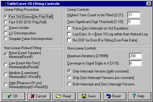フィットの最大項数 Highest Term Count to be Fitted は、すべの近似関数に対して 21 がデフォルト設定になっています。項の有効閾値 Term Significant Digit Threshold の設定値 9 は、y 値に対して 1E-9 以上の効果がある場合、項として関数に加えられることを意味しています。強制ゼロ切片 Force Zero Intercept on Std Equations オプションは、TableCurve 2D の 3205 個の標準線形関数 (多項式関数、有理関数ではないもの) でフィッティングする際、原点を通過させるためのものです。