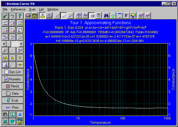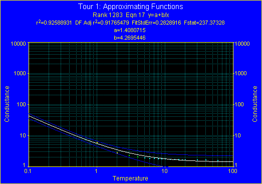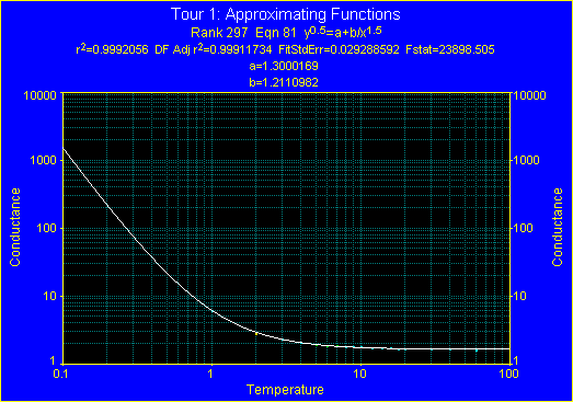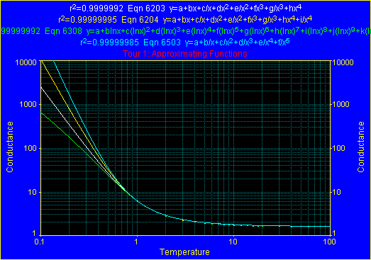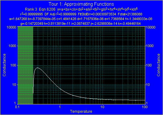 この段階では、近似式 #6204 がフィッティング近似関数として適しているかよりも、絶対零度方向へ外挿した場合、それがどれだけ信頼できるかという問題になっています。どのような外挿でも、データ範囲内の値を使って近似式を導き出しているということを忘れないで下さい。例えばサンプルのデータセットで、観測値のある 1°K 以下の領域で、思いもやらない現象が発生するとしたら、どうなるでしょうか?
