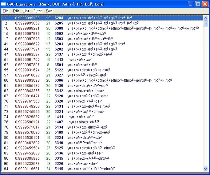 TableCurve 2D の Help|List Equations メニューコマンドをクリックすると、搭載している3665個の近似関数の一覧が表示されます。