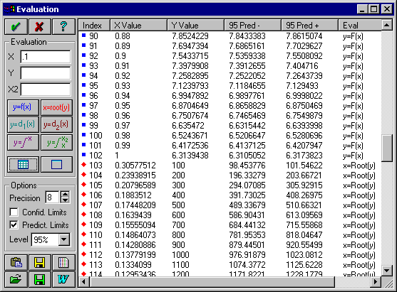 選択している近似式について、数値的な評価を行うことができます。評価テーブルには、すべての計算の履歴を残すことができます。1つ1つ入力する方法と、テーブルに情報を自動的に追加する方法の 2つがあります。