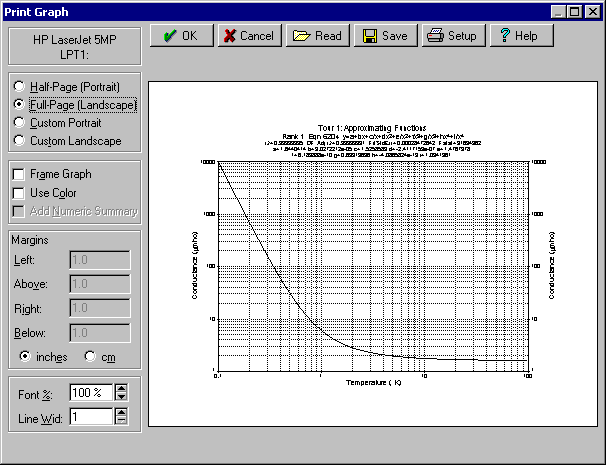- Review Curve-Fit ウィンドウのツールバーにある Print Graph ボタン をクリックして下さい。印刷のプレビューが自動的に表示されます。印刷形式とオプションを設定して OK ボタンを押して下さい。