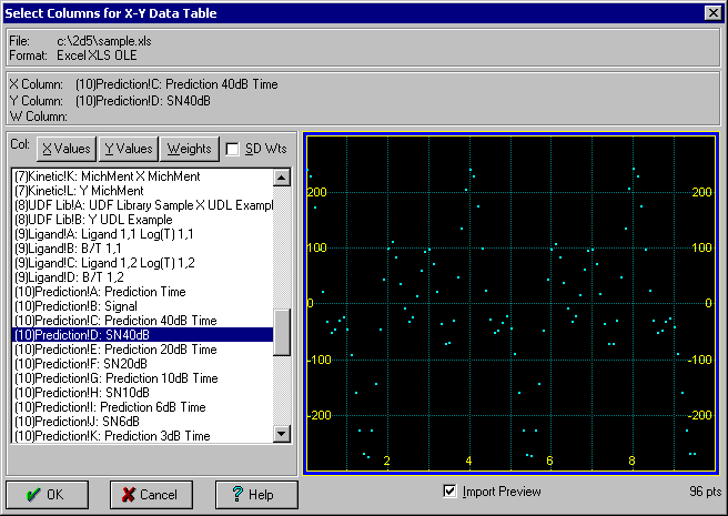 - X-values として (10)Prediction!C: Prediction 40dB Time のラベルが付けられた列を選択します。Y-valuse には、 (10)Prediction!D: SN40dB を選択します。Import Preview のチェックボックスを ON にすると、インポートするデータのグラフが表示されます。