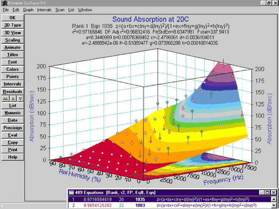 最大 15 のユーザー定義方程式を入力することができます。このような特殊モデルには、特殊関数、収束級数、条件文、微分、積分、パラメータ制約など、ほとんどの数学的構成要素を含めることができます。 TableCurve 3D には、ユーザー定義モデルのフィットが確実に収束するように、方程式パラメータをグラフィカルに調整するオプションもあります。他のサーフェスフィッティングプログラムとは異なり、TableCurve 3D のユーザー定義関数はコンパイルされるため、組込み方程式とほぼ同等の速度でフィッティングを行うことができます。ユーザーの関数を独立したファイルとしてまたはライブラリに、あるいは両方で保存できるオプションがあり、柔軟に対処できます。