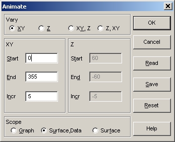 - 現在の設定は、XY 回転、開始が 0 度で 5 度ずつ 355 度までステップし、Surface, Data を表示するようになっています。これで OK ボタンを押して下さい。
