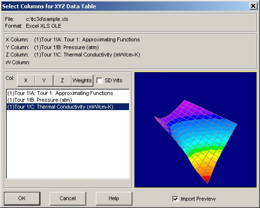 - (1)Tour 1!A Tour 1: Approximating Functions のラベルが付いた列を X 値に選択します。Y値は (1)Tour 1!B Pressure(atm) を、Z値には (1)Tour 1!C Thermal Conductivity (mW/cm-K) を選択します。Import Preview チェックボックスを ON にすると、インポートするデータのノンパラメトリックサーフェスが表示されます。