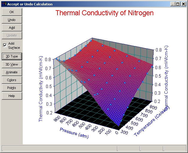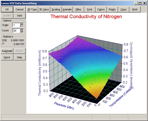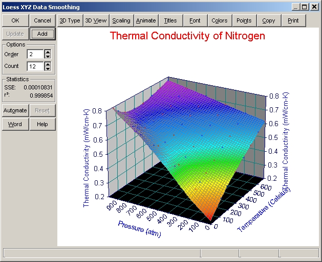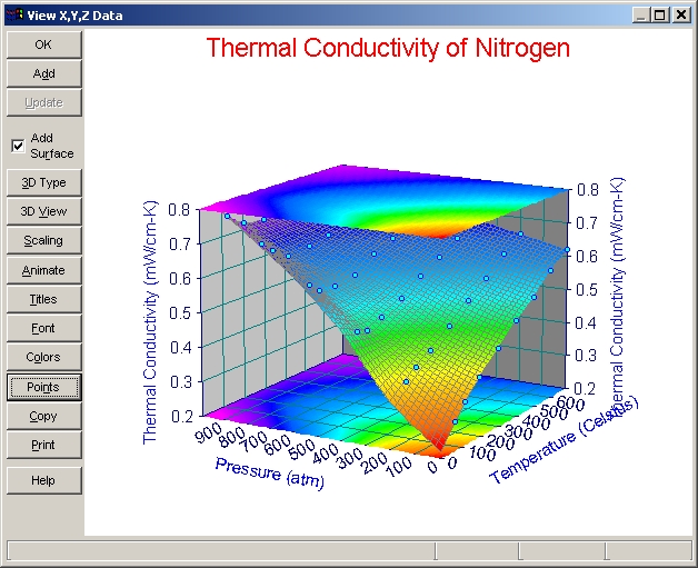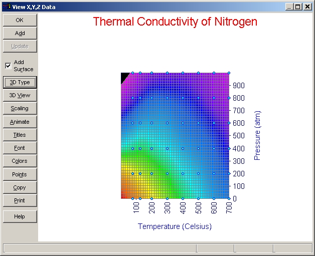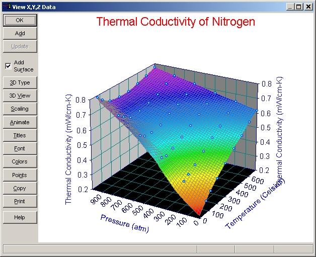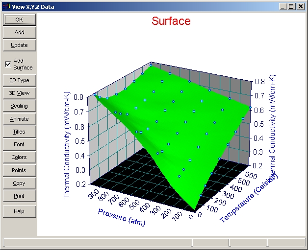 ボタンパネルの 3D Type、3D View、Scaling、Animate、Titles、Font、Colors、Points、Copy、Print は、サーフェスとデータを持った TableCurve 3D のグラフにすべて共通しています。これらのオプションを試して見て下さい。オプション設定のウィンドウにある Reset ボタンを押すと、デフォルト設定に戻ります。設定を変更すると、直ちにその変更が反映されます。