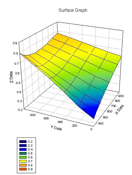 追加アイテムや出力アイテムと異なり、初期データセットにはグラフの設定メニューはありません。その代わり View|Data Graph の最新設定に基づいて、サーフェスプロットがメインウィンドウに表示されます。この設定は、Data Graph コマンドが実行される度に自動的に更新されます。