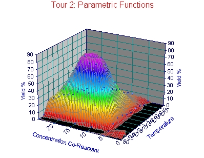 増加 3D ピーク関数では、XY 変数によってピークが形作られます。この場合、特定の温度と共反応のレベルがピークを作り出しています。低温度の境界付近では共反応のレベルも高くありません。同様にゼロ付近の共反応レベルでは、温度も高くありません。
