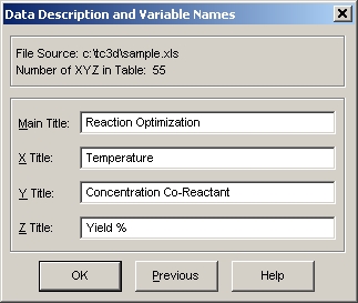 この XYZ データアイテムには、あらかじめタイトル名が設定されています。タイトル名は、TableCurve 3D で何かの操作をする度に使用されます。また TableCurve 3D Explorer (メインウィンドウの左側セクション) にデータアイテムといっしょに保存されます。