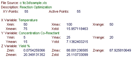 サーフェスフィッティングによって、温度と共反応による最大の反応条件をみつけることが、このサンプルの目的です。したがって、2つの変数の中央値は重要なパラメータとなります。