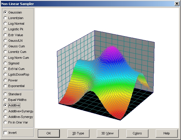- ピークの形と特性が何を意味しているのか TableCurve 3D で知るには、View|Non-Linear Sampler メニューコマンドを実行します。ピークの種類 (上のセクション) からどれかを選び、プロファイル (中央のセクション) でまず Standard を選択し、次に Additive を選択して下さい。