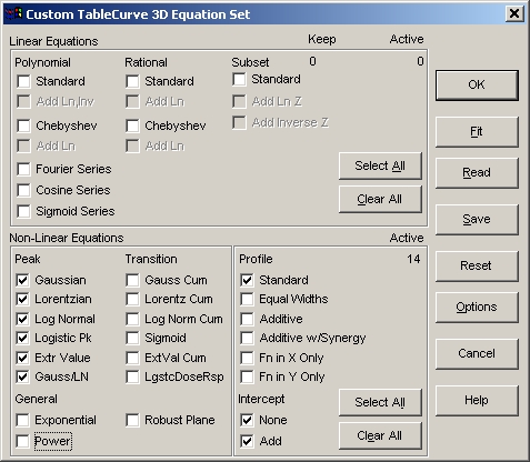 ボタンをクリックします。Linear Equations セクションの Clear All ボタンを押し、Non-Linear Equations セクションでは 6つの Peak タイプすべてと、Standard プロファイル、Intercept オプションの None と Add のみを ON にして下さい。Active な非線形関数の数は、14 と表示されます。