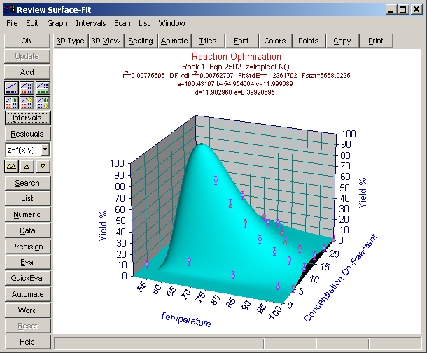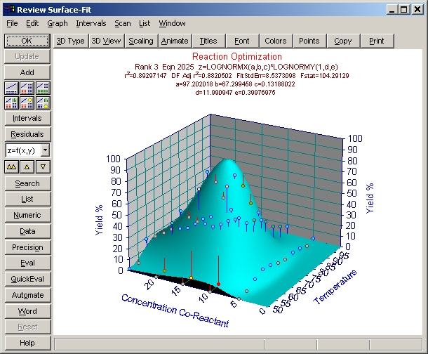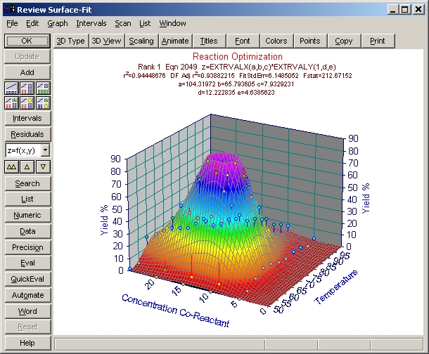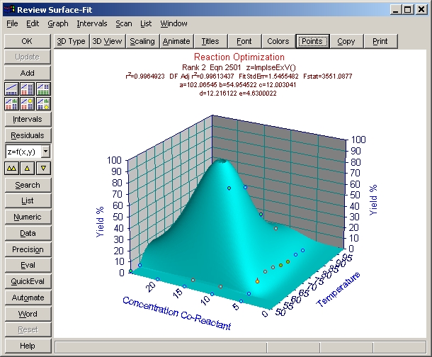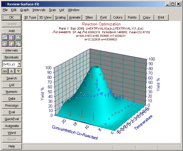 このデータセットは 55 の反応サンプルで構成されており、50%を超える値をもっているのは 8 サンプルだけなので、最適値は (65, 10) の位置で 88~89%とういう結論は受け入れやすいかもしれません。サーフェスフィッティングは、厳密に最適値を導いてくれます。すなわち (63.3, 12) で、最もよい値が得られます。
