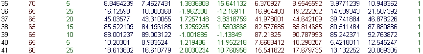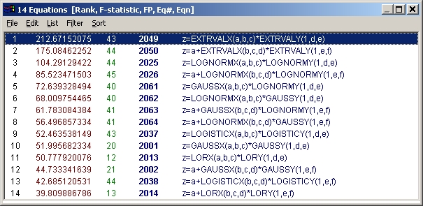 ボタンをクリックすると、TableCurve 3D 標準の 72個の非線形ピーク関数でフィッティングを実行します。ここでは、データによくマッチするのがわかっていますので、標準ピーク関数についてのみ説明します。また線形モデルを使用してもよいフィッティングは行えるのですが、近似関数は2変数の中央付近とは関係のない係数を持つことになります。