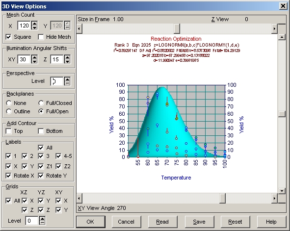 - プロットの上でマウスクリックをして 3D View Options ウィンドウを開き、Mesh Count セクションの x ボックス内でマウスの右クリックをします。表示されたリストからメッシュ数 240 を選択し、OK ボタンを押します。