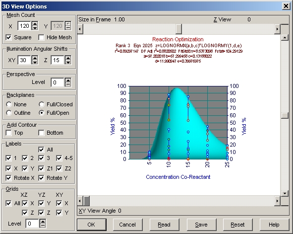 TableCurve 3D ノートブックに保存したときのサーフェスフィッティングの状態で、Review Surface-Fit ウィンドウが表示されます。数式リストも同じものが表示され、フィッティングオプションも同じです。グラフの設定も同じになります。