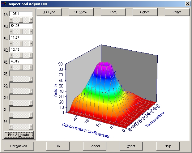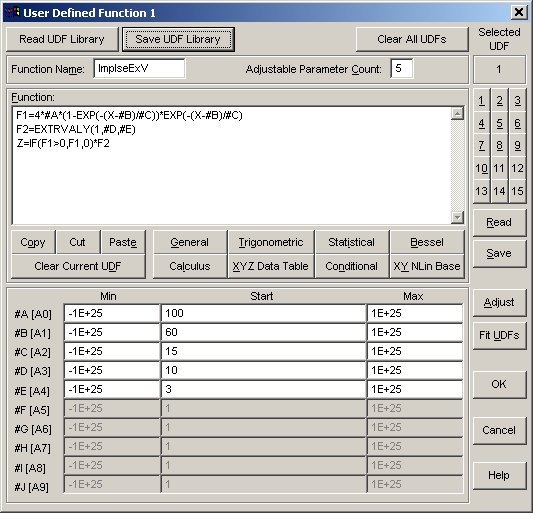 - 最初のユーザー定義関数と同じように、Adjust ボタンを押して Inspect and Adjust UDF ウィンドウを開き、Find and Update ボタンを押します。パラメータ値がアップデートされたら OK ボタンを押して下さい。パラメータの推定値がよければ、OK ボタンを押してメインメニューに戻ります。