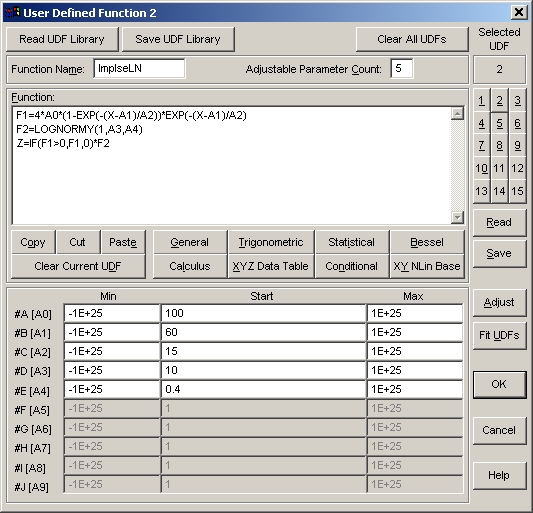 - 数式リスト最上位のインパルス – 対数正規分布関数を選択して、Numeric ボタンを押して下さい。統計情報は、この最上位のユーザー定義関数のものです。