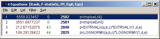 2つのユーザー定義関数と共に、2つの標準の非線形関数のフィッティングが実行されます。数式リストには、4つの関数が表示されます。