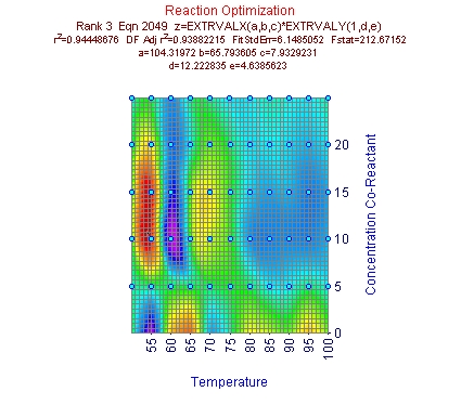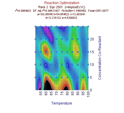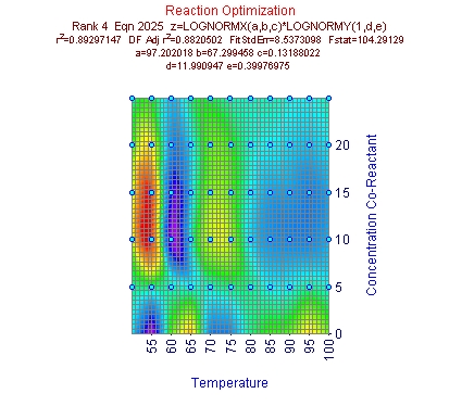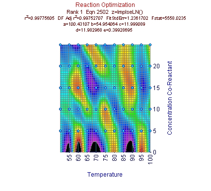 - このチュートリアルの最終目的は、反応の最大値が得られる最適条件、すなわち最適な温度と共反応濃度を見つけ出すことです。最もよいフィッティング関数を使った場合、温度 63.3 度、濃度 12.0 が最適条件となります。2番目によいフィッティング関数を使った場合は、 63.3 度、濃度 12.2 です。
