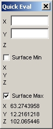 - QuickEval ボタンを押し、Surface Max ボックスにチェックを入れます。4つのフィッティング関数を気鋭変えて下さい。それぞれの Z 最大値と位置が表示されます。