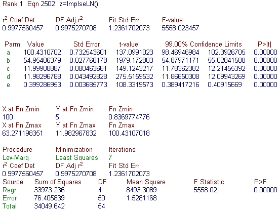 対数正規分布の中央値 d は、11.983 です。同様に Y at Fn Zmax の値も、11.983 であることに注目して下さい。これにより、共反応の最適濃度は基本的に 12.0 であると判断できます。インパルスの中央値 b は、54.95 です。ただし、X at Fn Zmax は 63.27 となっています。明らかにインパルスピークのパラメータは、Z の最大値中央を提示していません。ここで、ピーク中央は b+c*ln(2) すなわち 63.27 であることがわかっていますので、最適温度が 63.3 度であるか確認しましょう。