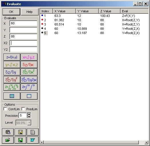 - (63.3, 12) が理想的な値であることを確認するために Eval ボタンをクリックし、Evaluate ウィンドウの X に 63.3、Y に 12 を入力して下さい (他はすべて空欄です) 。Z=F(X,Y) ボタンを押すと 100.4% と計算されます。