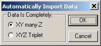 TableCurve 3D は、自動的に XYZ データとしてデータソースまたはワークシートを読込みます。これは、File|Autospecify All XYZ Data Items メニューコマンド、メインツールバーの