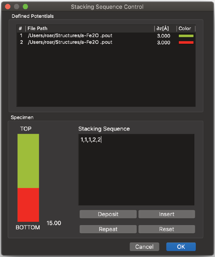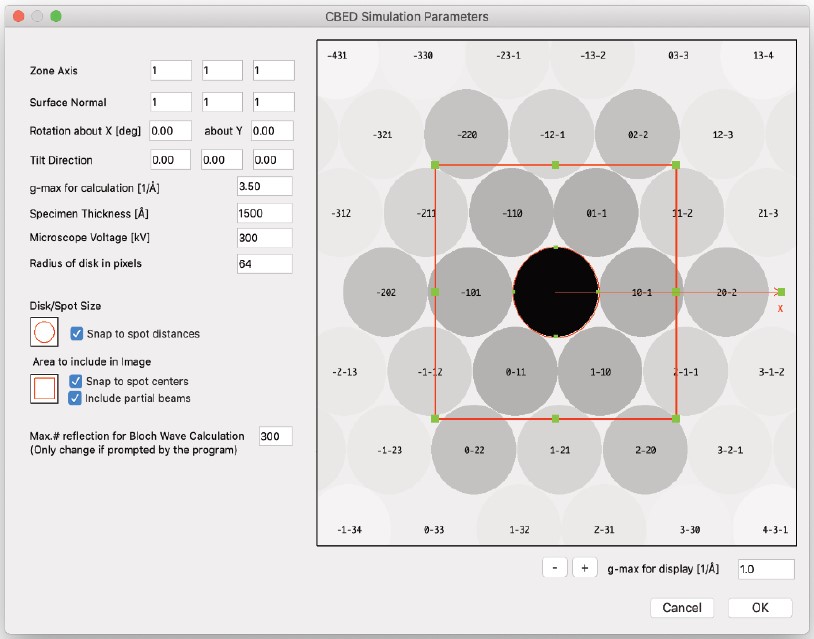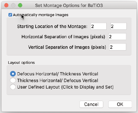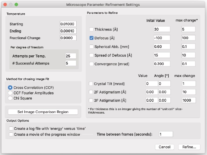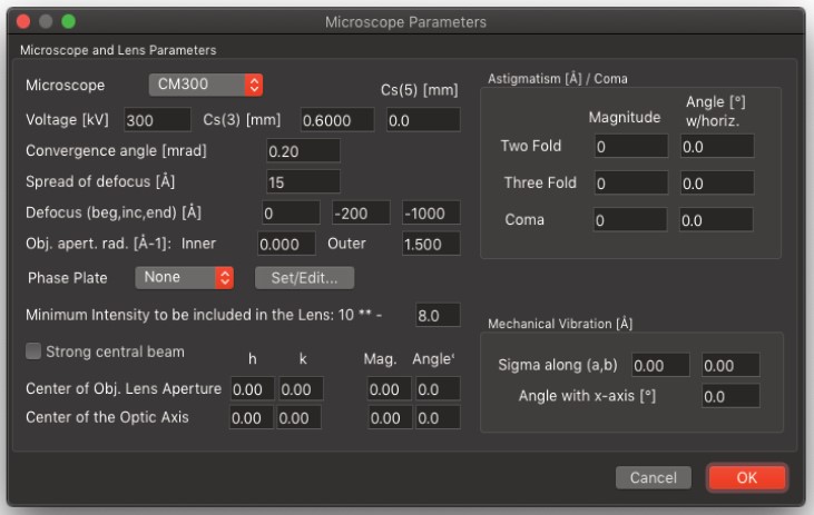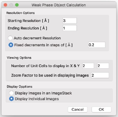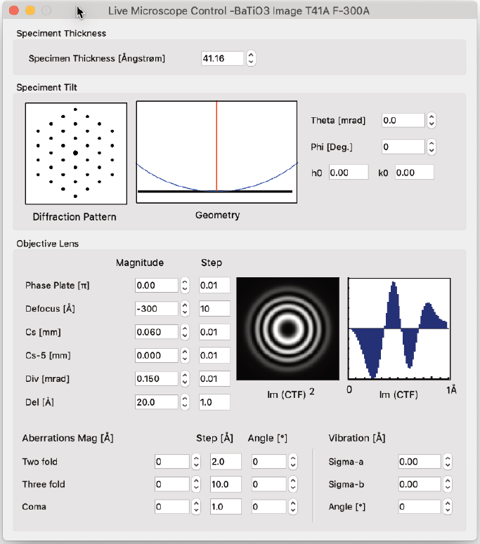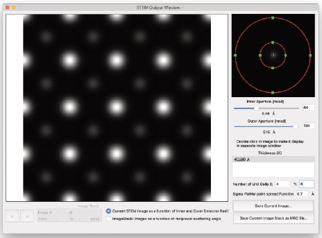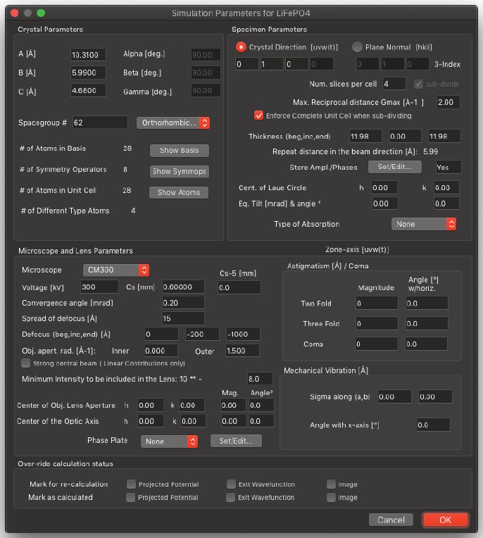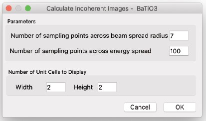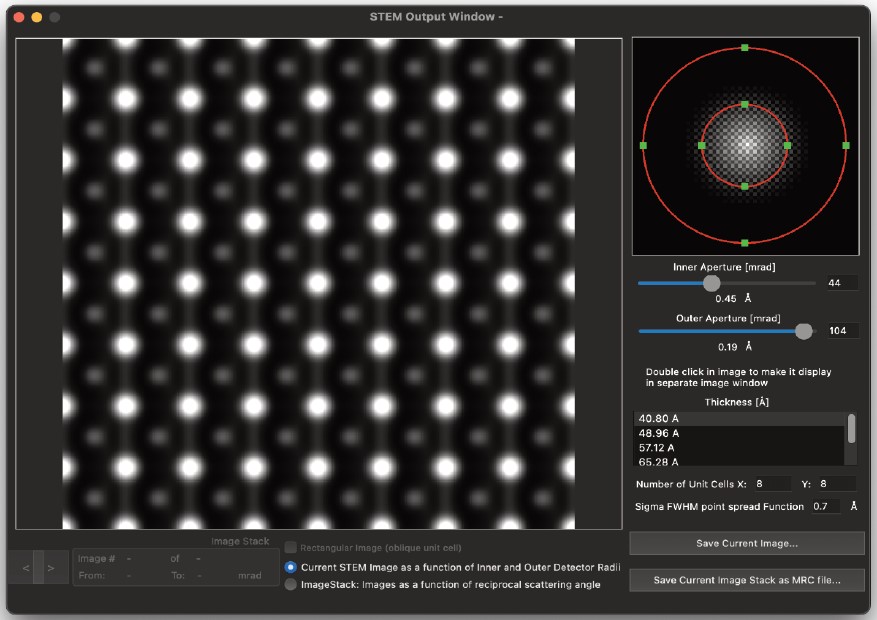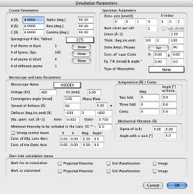 結晶の投影ポテンシャル (Projected Potential コマンド) の計算では試料の構造のみを考慮しますが、電子波動場 (Exit Wavefunctions(s) コマンド) の計算では試料と電子波動の相互作用を取扱い、Image(s) normal calculation コマンドでは電子顕微鏡のレンズシステムを考慮したシミュレーションを行います。一度シミュレーションを実行したら、以後のシミュレーションではすべてを再計算する必要はありません。電子顕微鏡のパラメータ (電圧を除く) を変えただけなら、投影ポテンシャルおよび出射面の波動関数の計算には何の影響もありません。結晶構造像を再描画するだけで済みます。電子顕微鏡の電圧、または試料の厚さ・傾斜を変更した場合には、投影ポテンシャルの計算には影響はありませんが、出射面の波動関数と結晶構造像は再計算する必要があります。試料の構造を変更した場合は、もちろんすべての再計算が必要となります。