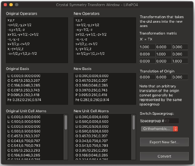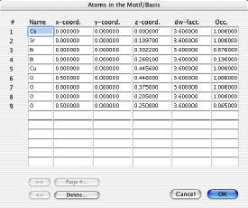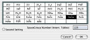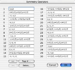 可能な場合は、空間群の追加設定を行うことができます。特に空間群を指定しない場合は、対称操作が x, y, z だけの空間群 P1(1) を使用して下さい。対称操作のダイアログを開くと、追加の対称操作が指定できます。