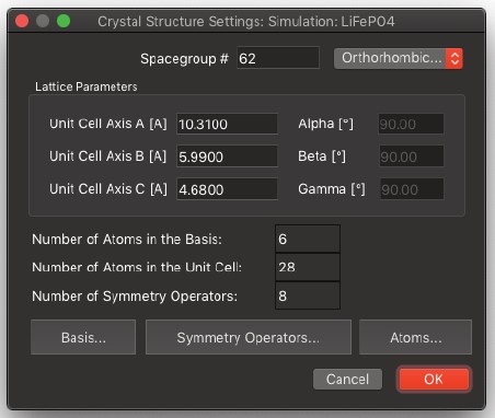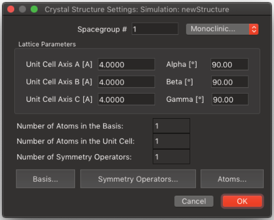 シミュレーションを実行するために最初のステップは、入力ファイルの作成です。これは、File|New Structure File… メニューコマンドで実行することができます。このコマンドを実行すると、立方晶のデフォルト設定値がダイアログに標示されます。作成したい構造のテンプレートとして使用して下さい。