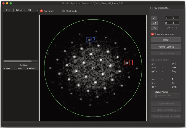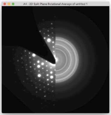 2つの信号は周波数領域において明確に異なる特性を示します。非晶質成分は逆格子空間に広がり、その振幅は逆格子ベクトルの大きさに依存し、ランダムな変動を除いて方位角とは無関係とみなせます。結晶性物質からの信号は、原子面間の間隔に対応する特定の空間周波数付近でピークを示します。実空間の情報は分離不可能である一方、2つの信号は周波数領域においてかなりの程度まで分離可能であります。